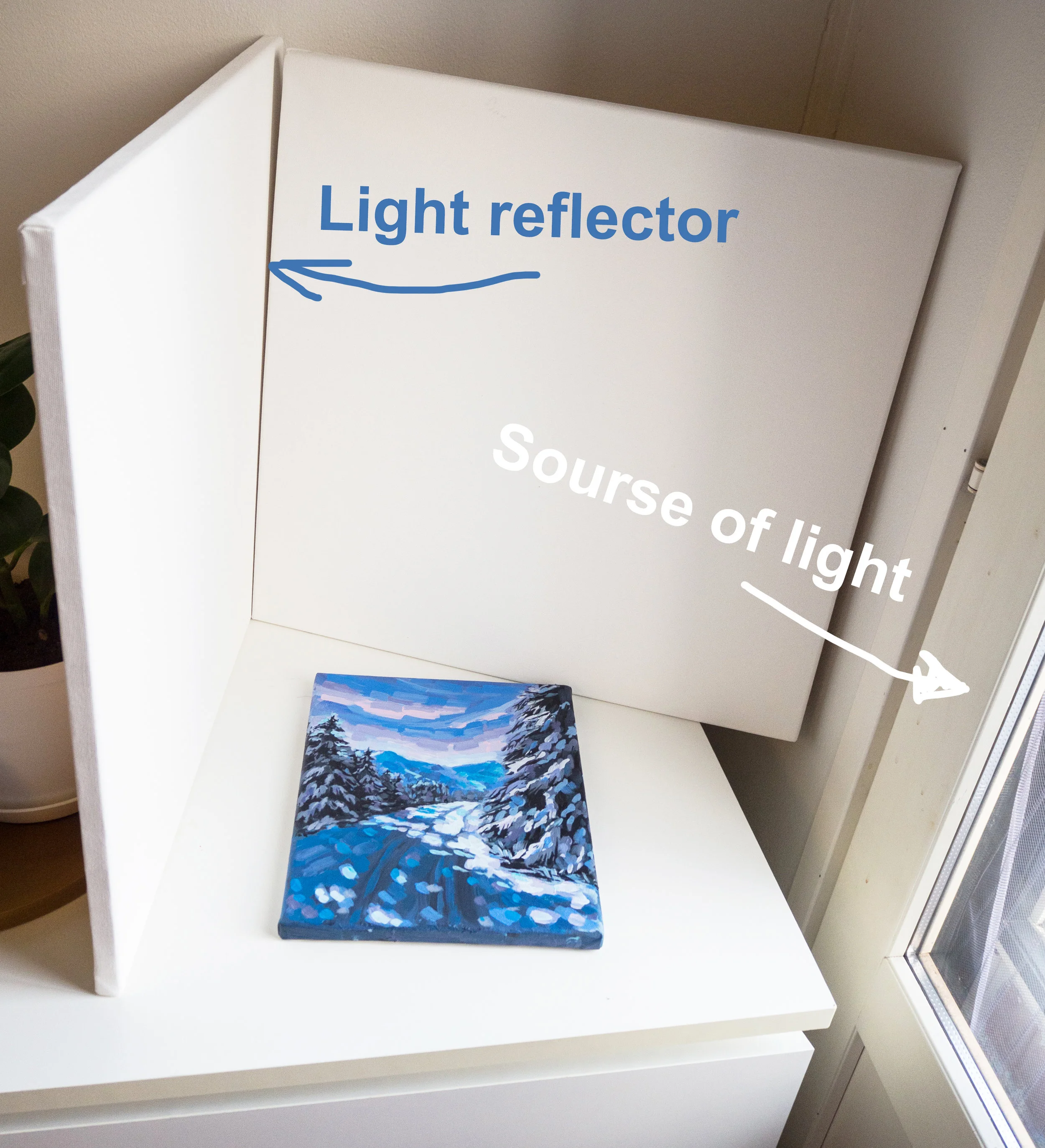 • light reflectors. You can buy fancy ones but I just use a white canvas for this. Position the canvas against a source of light (aka window), light will reflect and make the other side of the object less shadowy, this is one of my secret tips